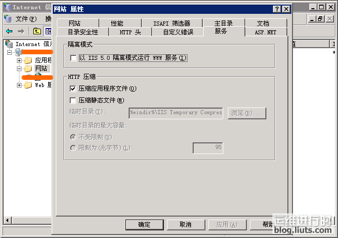 1.1、在 "IIS 管理器" 中,打开 "网站 > 属性" 对话框,切换到 "服务" 页卡,选中压缩应用程序文件(社区页面不做静态文件的压缩)压缩选项。点击在新窗口中浏览此图片