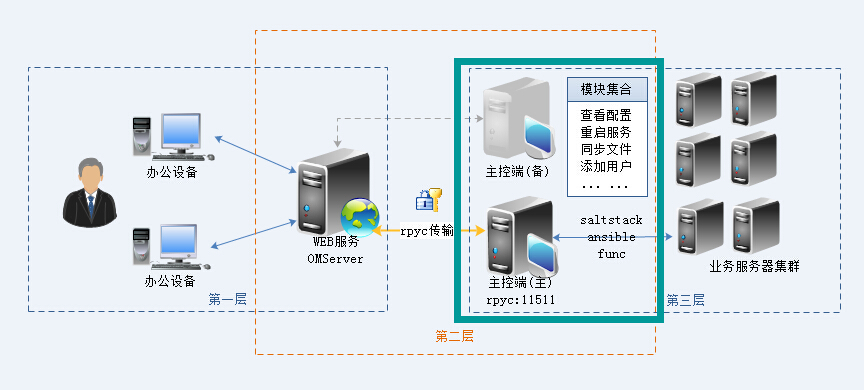 主控端是OMServer的核心角色,负责接收加密的协议串且进行解密,解析成OMServer调用的任务模块,同时结合角色中的saltstack、ansible或func组件,向目标业务服务器集群(被控机)发送执行任务,执行完毕后,将返回的执行结果加解密处理,最后逐级返回给系统管理员,角色所在位置见以下架构图: