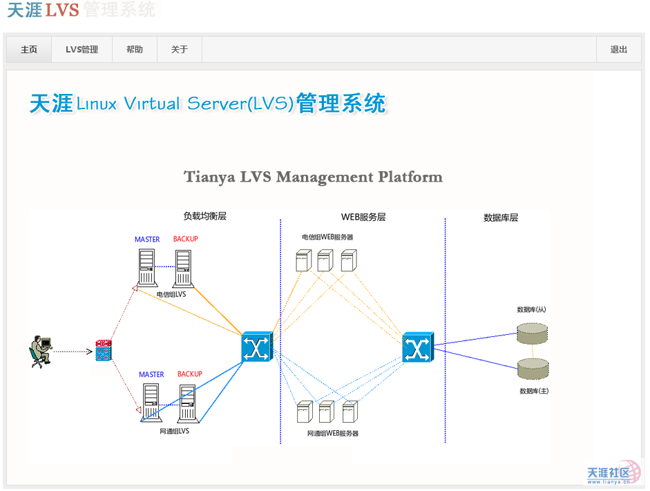 由于第一版的LVS管理平台是整合到现有的运维系统中,现用CodeIgniter框架+certmaster+func重写了老的管理平台,比原系统更具有独立性,主要功能模块分为性能图表、数据中心、虚拟IP池、主机管理、监控模块、生成hosts、主机探测等功能,基本上是按F5-LTM管理平台思路来设计,下面只要对这几大块功能进行说明。